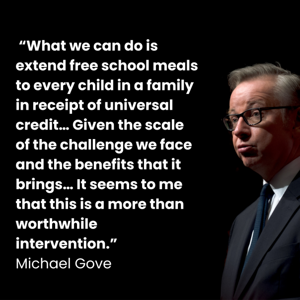 Gove said: “What we can do is extend free school meals to every child in a family in receipt of universal credit… Given...