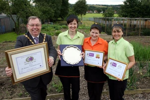 The Meadows Community School in Chesterfield has won in 2012, with catering supervisor Jeanette Kirk and team members Edith Smith and Michelle Ashby being presented with the award by Derbyshire CC chairman George Wharmby.