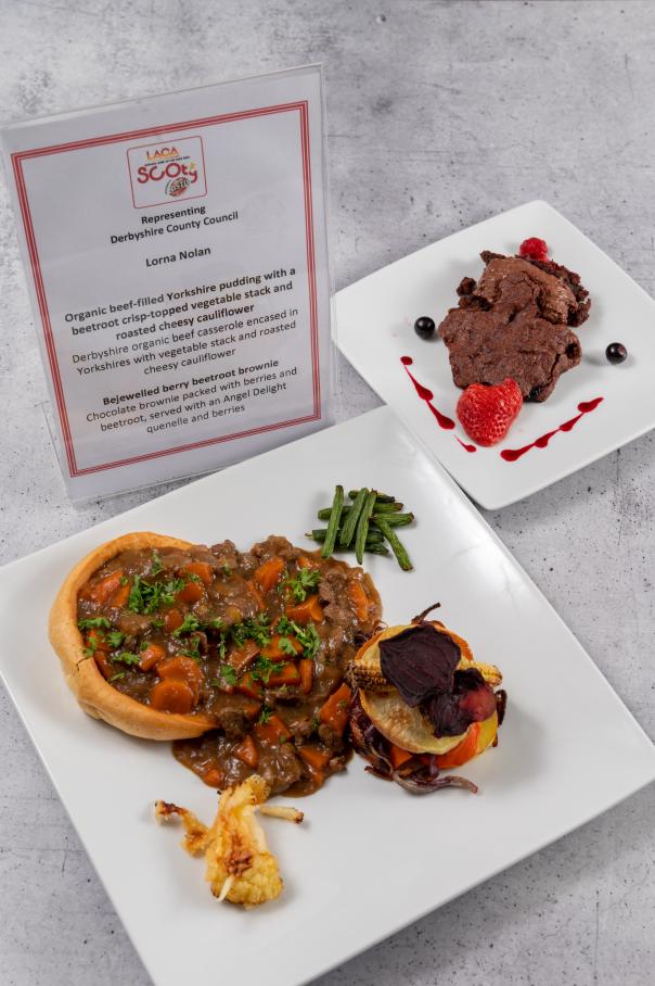 For her main course Lorna made organic beef-filled Yorkshire pudding with a beetroot crisp-topped vegetable stack and roasted cheesy cauliflower, Derbyshire organic beef casserole encased in Yorkshires with vegetable stack and roasted cheesy cauliflower.
