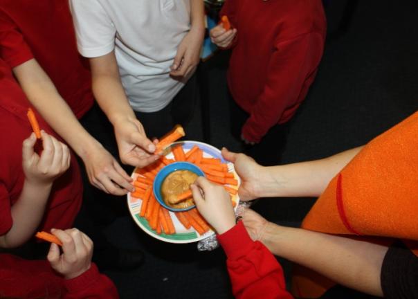 Chef supervisor Pam Flint and teaching assistant Dawn Hornsey dressed up as carrots to serve carrot dippers with a nut-free hummus for the campaign. Visiting every class and encouraging the children to try the veg tasters, the pupils were delighted.