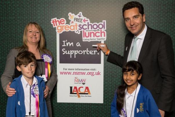 Pictured attached is Edward Timpson MP, Secretary of State for Children and Families showing his support for ‘The Great Free School Lunch’, LACA’s ambition that every child in England and Wales has access to a free meal during NSMW 4th – 8th November 2013.