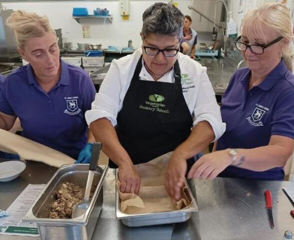 In late 2023, Maz and Nikita from the Vegetarian Society Cookery School team visited St John’s School to view the school catering service. The school, which is already ‘proud’ of its healthy lunch options, sought specialised vegetarian and vegan training for its catering team.