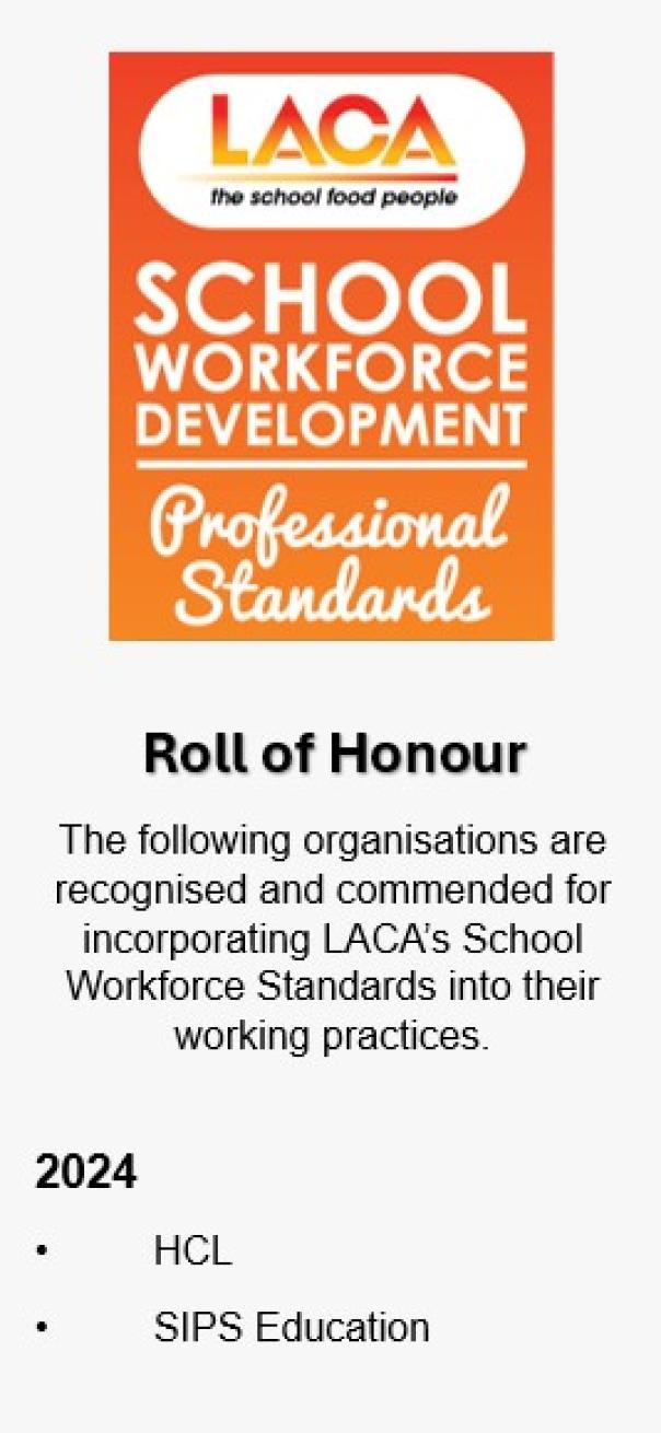 The following organisations are recognised and commended for incorporating LACA's School Food Workforce Standards into their working practices.